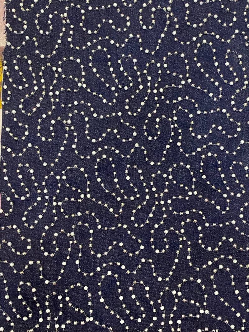 Эта ткань из 100% хлопка объединяет в себе силу и универсальность денима с утончённым блеском декоративной вышивки. На плотной джинсовой основе изящно рассыпаны узоры из стекляруса. которые напоминают мерцающие капли света на ночном море.