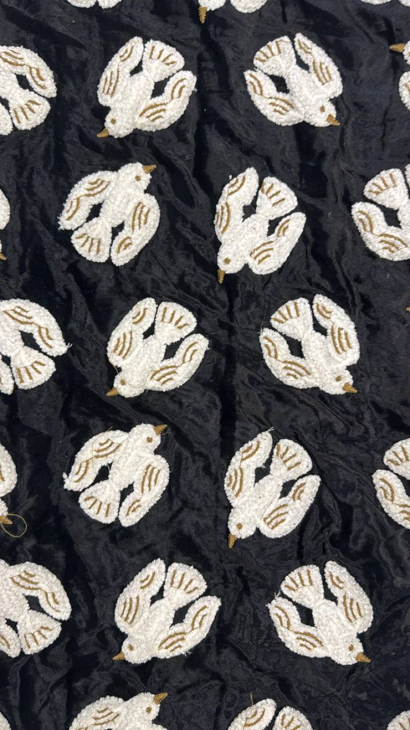 На глубокой черной бархатной основе расправляют крылья изысканные белые птицы. вышитые вручную. Их объёмные силуэты. дополненные золотистыми акцентами. создают впечатление движения и лёгкости. будто стая голубок взмывает в вечернее небо.