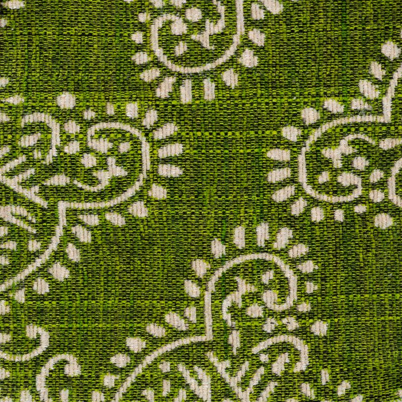 Эта ткань сочетает в себе прочность хлопка и декоративность жаккардового плетения. С обеих сторон проявляется орнамент: с одной — на светлом фоне расцветает зелёный узор. с другой — светлый орнамент играет на насыщенной зелёной основе.